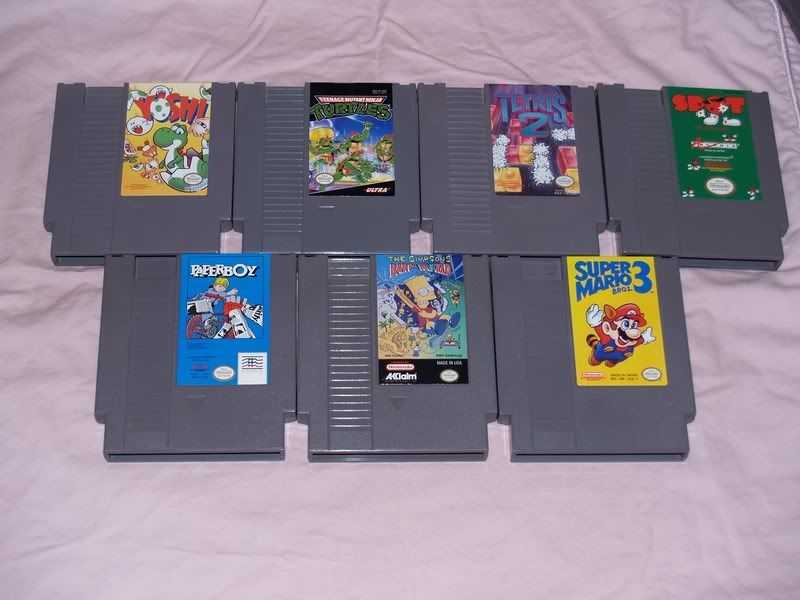 Zelda Tips & Tactics Guide (special order from Nintendo, very rare) STILL AVAILABLE, MAKE OFFER! ACCESSORIES -Two regular NES controllers with the birthday and circuitry themed stickers on them. The circuitry controller has a lot of wear on the sticker itself. -NES Max controller -Zapper -Nintendo system case Everything in great condition!! INSTRUCTION MANUALS -SWEET DEAL 20 Shipped within the US for all manuals!! Star Tropics Wheel of fortune Jeopardy Spot Bases Loaded III Donkey Kong III Anticipation Ninja Turtles Yoshi Paperboy Bart vs. the World Super Mario III Tetris II SNES Manuals Super Mario World 2: Yoshi's Island(near mint) Battletoads in Battlemaniacs(cover is a bit worn) GAMES(Near mint/mint unless otherwise noted) SWEET DEAL - 23 shipped within the US for all games!! That's less than 2 bucks a game! Bases Loaded III Yoshi Ninja Turtles Tetris 2 Paperboy Captain Comic (blue cart w/rental sticker on back) NOT in PIC Anticipation Mario/Duck Hunt/World Class Track Meet Dragon Warrior |